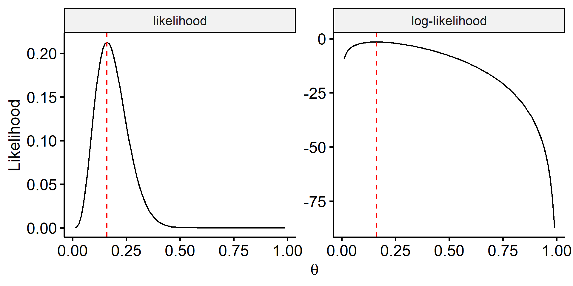 ↩︎1 2 3 4 5 6 7 8 9 10 11 12 13 14library(dplyr) library(tidyr) library(ggpubr) data.frame( theta = seq(0.01, 0.99, 0.01) ) %>% mutate(likelihood = choose(25, 4) * theta^4 * (1-theta)^21, `log-likelihood` = log(likelihood)) %>% pivot_longer(-theta, names_to = "Function", values_to = "Value") %>% ggline(x = "theta", y = "Value", plot_type = "l", numeric.x.axis = T) %>% facet(facet.by = "Function", scales = "free_y") + geom_vline(xintercept = 0.16, color = "red", linetype = "dashed") + labs(x = expression(theta), y = "Likelihood")These conditions arise from the confidence interval being a normal approximation. For details, see this section from the mathematical statistics course. ↩︎