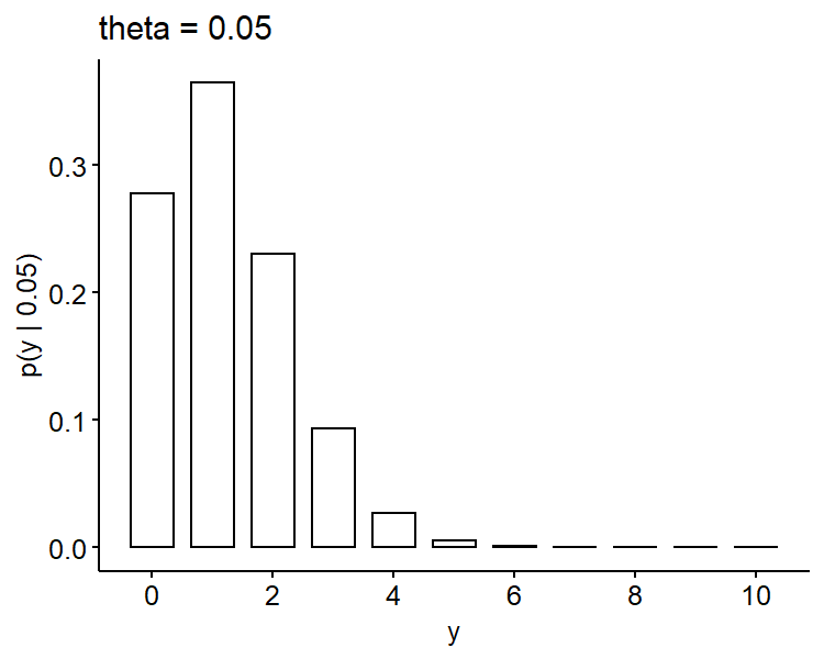 ↩︎1 2 3 4 5 6 7 8 9 10 11 12 13 14 15 16 17library(dplyr) library(ggpubr) library(gganimate) p <- data.frame( y = rep(0:10, times = 3), theta = rep(c(0.05, 0.10, 0.15), each = 11) ) %>% mutate(prob = dbinom(y, 25, theta)) %>% ggbarplot(x = "y", y = "prob") + scale_x_continuous(breaks = seq(0, 10, 2)) + transition_states(theta) + ease_aes("cubic-in-out") + ggtitle("theta = {closest_state}") + ylab("p(y | {closest_state})") animate(p, width = 5, height = 4, units = "in", res = 150)Code for generating figure 2: