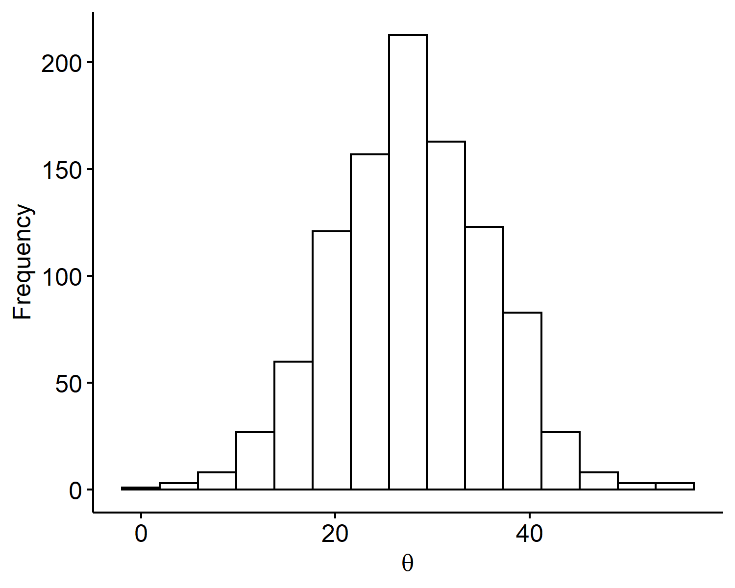 Thus the prior is set to be $\theta \sim N(28, 8^2)$. Note that prior information is very subjective, and it’s not always easy to interpret the hyperparameters. If we are, say, 99% confident, then we may go out 3 sd’s instead of 2. Ultimately because we have 200 data points, this shouldn’t affect our posterior too much as it’s dominated by the observed data. Below is a plot of $S=1000$ Monte Carlo samples from our prior distribution generated via: