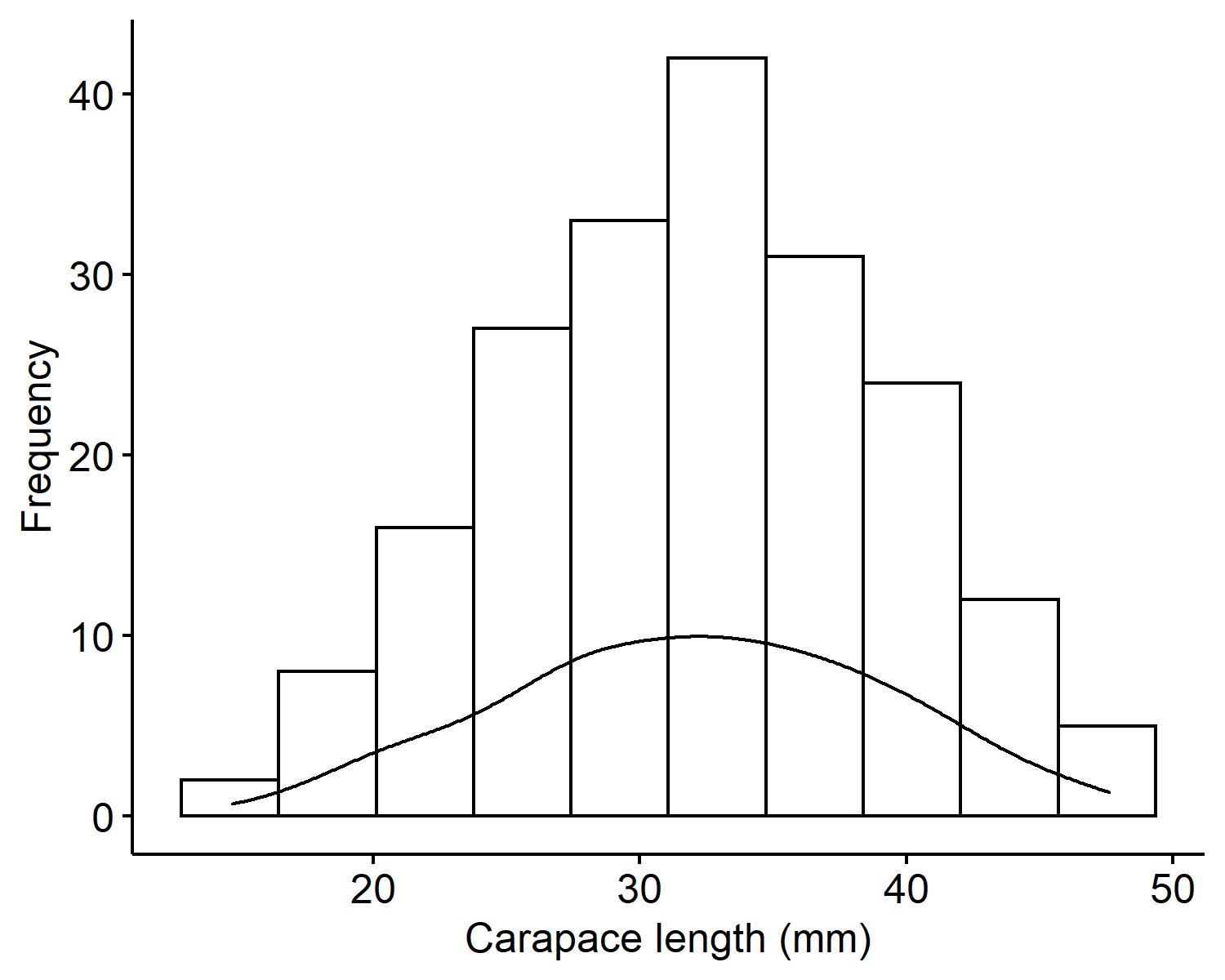 From the histogram of the carapace lengths2, we can see the values range from 10 to 50 millimeters and is centered around 30mm. The mean is 32.11mm and the variance is 50.68mm$^2$. The distribution looks overall symmetric with no outliers.