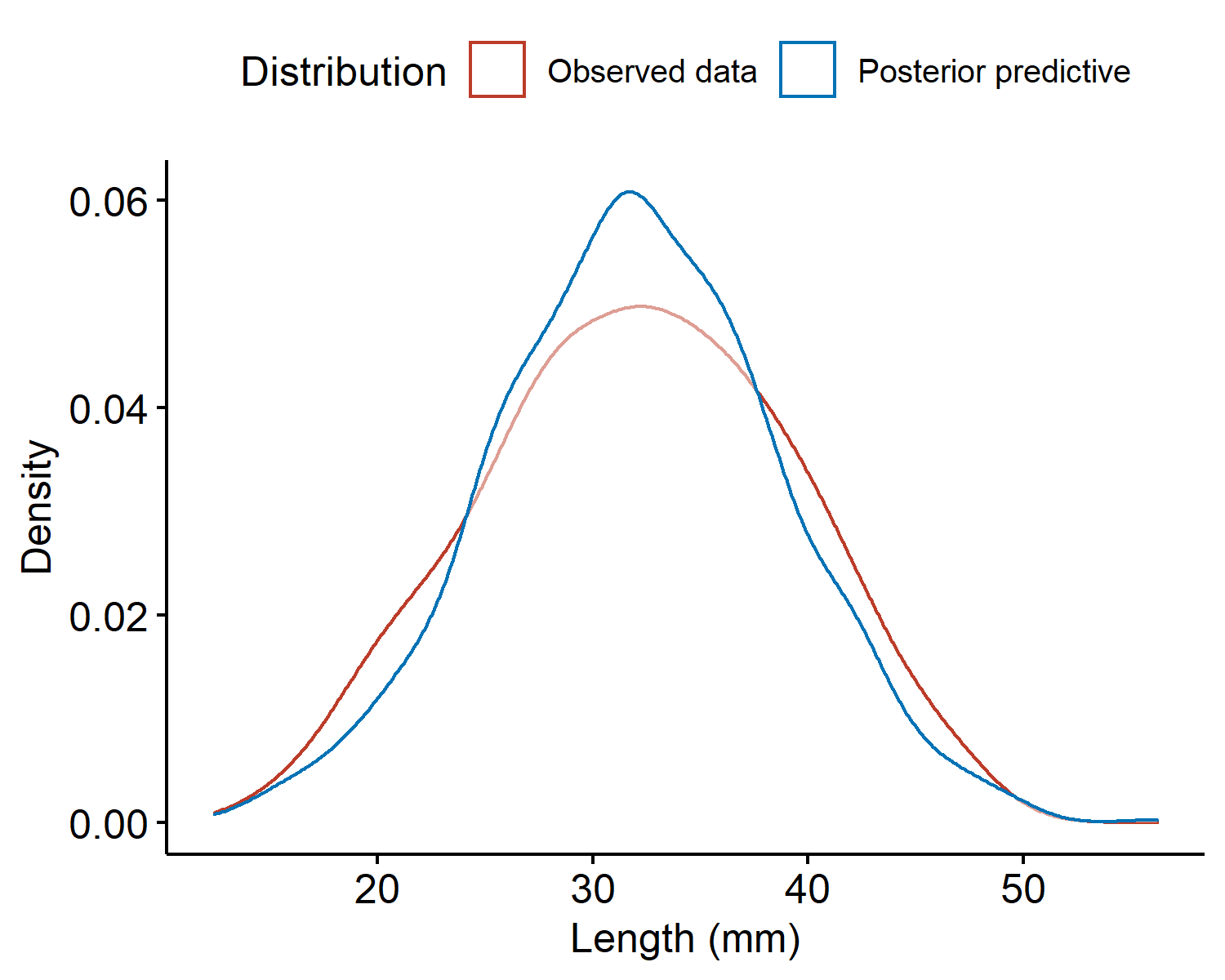 Then the set of values $\{\tilde{y}^{(1)}, \cdots, \tilde{y}^{(S)}\}$ is the empirical distribution of the posterior predictive. For our crab example, the densities of the observed data and the posterior predictive are given below.