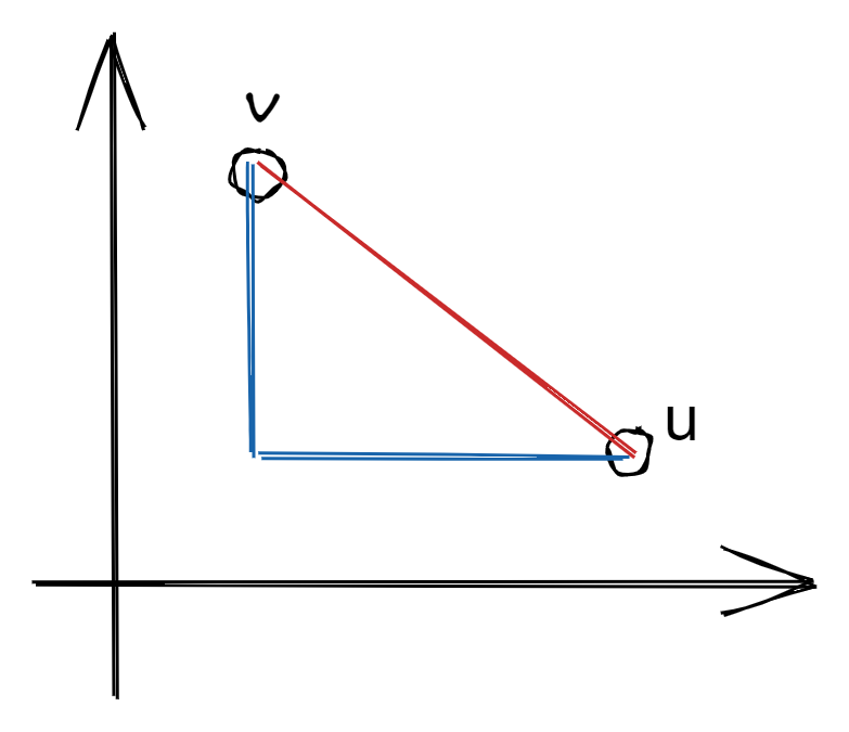 Manhattan distanceor $L_1$ distance, think of it as travelling from $\boldsymbol{u}$ to $\boldsymbol{v}$ but you can only move horizontally or vertically. ↩︎