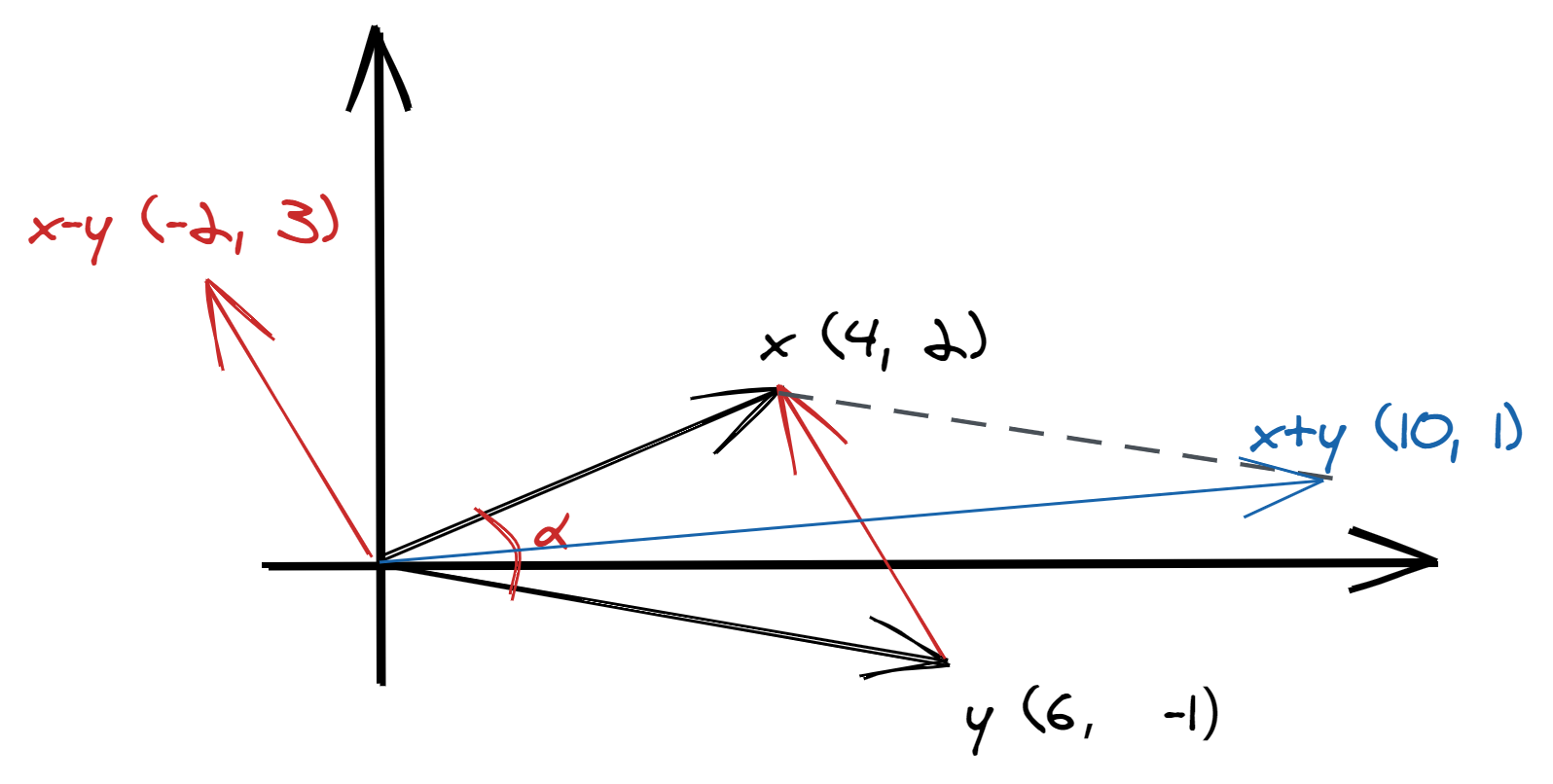 $$ \begin{aligned} \|\boldsymbol{x} + \boldsymbol{y}\|^2 &= (\boldsymbol{x} + \boldsymbol{y})^\prime (\boldsymbol{x} + \boldsymbol{y}) \\ &= \|\boldsymbol{x}\|^2 + \|\boldsymbol{y}\|^2 + 2 \boldsymbol{x}^\prime \boldsymbol{y} \\ &= \|\boldsymbol{x}\|^2 + \|\boldsymbol{y}\|^2 + 2\|\boldsymbol{x}\| \|\boldsymbol{y}\| \cos(\alpha) \end{aligned} $$