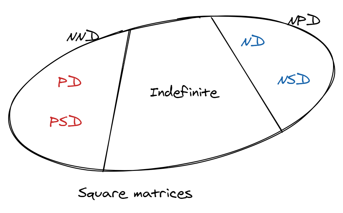 Given a real number $x$, if we say $x$ is not non-negative, then $x$ is negative. However, things are different for matrices. If a matrix is not NND, we can’t safely say it’s NPD. There exists a big “gray area” in the middle for matrices that are neither NND nor NPD called indefinite matrices. For those, $\boldsymbol{x}’\boldsymbol{Ax}$ can be negative and positive depending on $\boldsymbol{x}$.