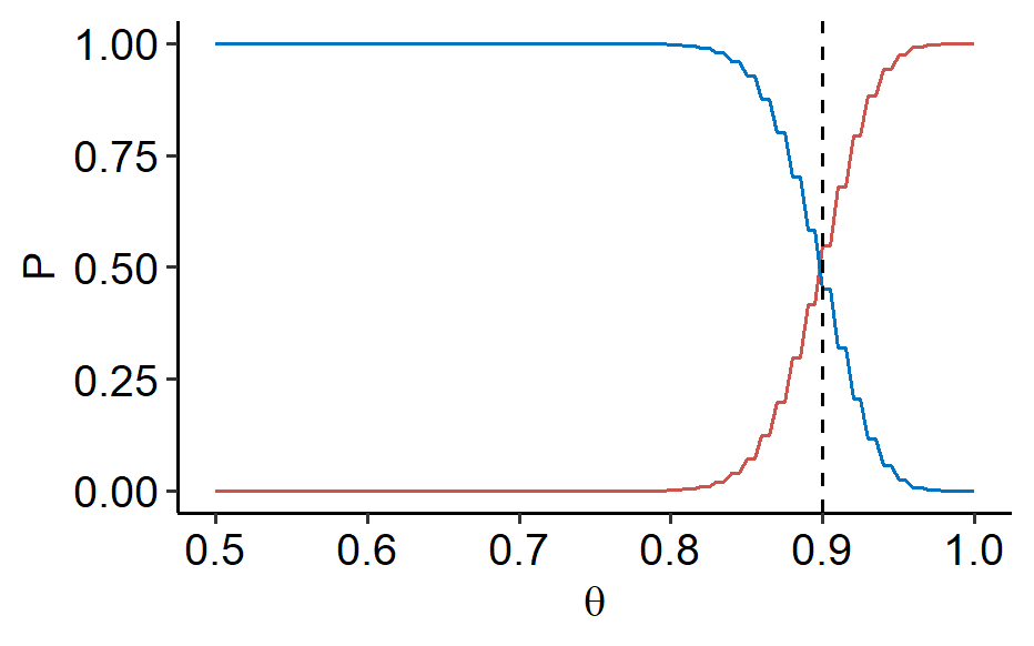 ↩︎1 2 3 4 5 6 7 8 9 10library(ggplot2) ggplot(NULL, aes(x = c(0.5, 1))) + stat_function(fun = ~ pbinom(100*., size = 100, prob = 0.9), geom = "line", color = "#CD534C") + stat_function(fun = ~ 1 - pbinom(100*., size=100, prob=0.9), geom = "line", color = "#0073C2") + geom_vline(xintercept = 0.9, linetype = "dashed") + labs(x = expression(theta), y = "P") + ggpubr::theme_pubr()