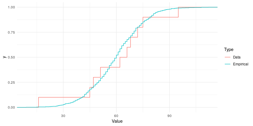 ↩︎1 2 3 4 5 6 7 8 9 10 11 12library(tidyverse) set.seed(42) tibble( Type = c(rep("Empirical", 1000), rep("Data", 10)), Value = c( round(rnorm(1000, mean=60, sd=15)), round(rnorm(10, mean = 60, sd = 15)) ) ) %>% ggplot(aes(Value, color = Type)) + stat_ecdf(geom = "step")+ theme_minimal()Lilliefors, H. W. (1967). On the Kolmogorov-Smirnov test for normality with mean and variance unknown. Journal of the American statistical Association, 62(318), 399-402. ↩︎
