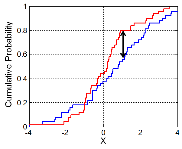 As before, this is taken as the vertical distance between empirical CDFs. A simplified version would look like the table below, where we record the distance between the empirical distribution function of the two samples.