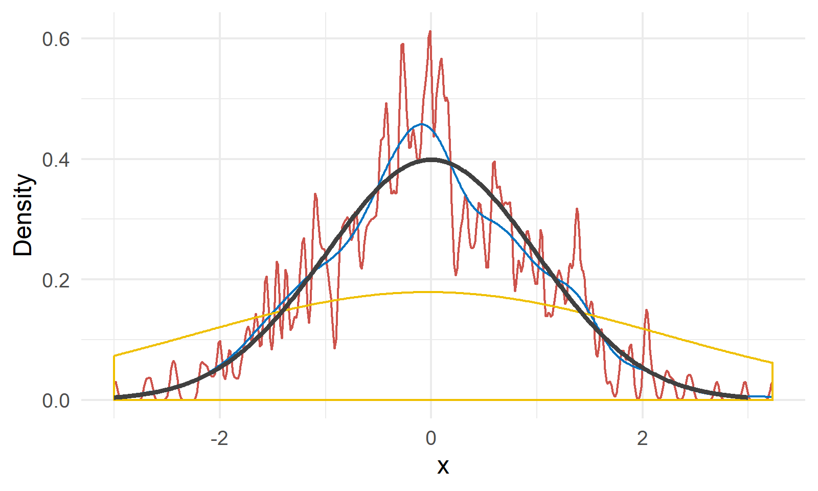 1 2 3 4 5 6 7 8 9 10 11 12 13 14 15 16 17 18library(ggplot2) set.seed(42) x <- seq(-3, 3, 0.01) true.density <- 1/sqrt(2 * pi) * exp(-x^2 / 2) random.x <- rnorm(length(x), 0, 1) dat <- data.frame(random.x = random.x) ggplot(dat, aes(random.x))+ geom_density(bw = 0.02, color = "#CD534C")+ geom_density(bw = 0.2, color = "#0073C2")+ geom_density(bw = 2, color = "#EFC000")+ geom_line(aes(x = x, y = true.density), color = "#404040", size = 1)+ xlab("x")+ ylab("Density")+ theme_minimal()