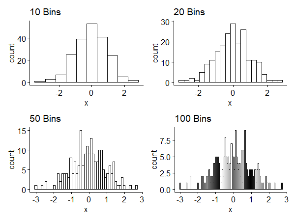 ↩︎1 2 3 4 5 6 7 8 9 10 11 12library(ggpubr) library(patchwork) set.seed(42) dat <- data.frame(x = rnorm(200, 0, 1)) p1 <- gghistogram(dat, x = "x", bins = 10, title = "10 Bins") p2 <- gghistogram(dat, x = "x", bins = 20, title = "20 Bins") p3 <- gghistogram(dat, x = "x", bins = 50, title = "50 Bins") p4 <- gghistogram(dat, x = "x", bins = 100, title = "100 Bins") (p1 + p2) / (p3 + p4)For more graphical representations, see this Wikipedia page. ↩︎