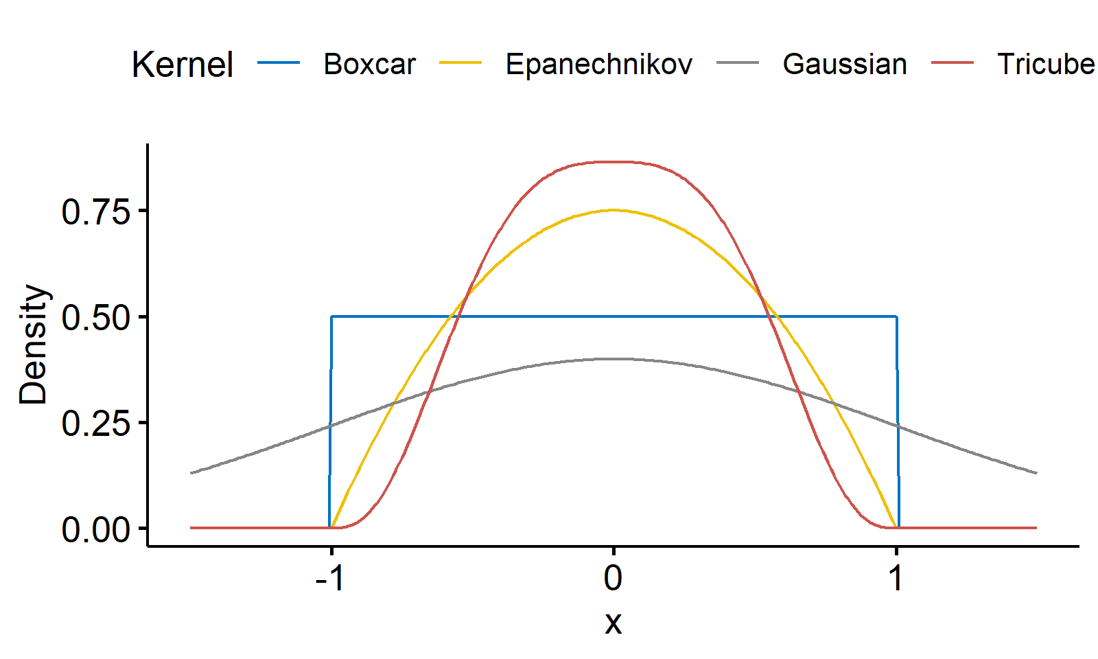 ↩︎1 2 3 4 5 6 7 8 9 10 11 12 13 14 15 16 17 18 19 20 21 22 23 24 25 26 27 28 29 30 31 32library(tidyr) library(ggplot2) indicator <- function(x) { ifelse(abs(x) <= 1, 1, 0) } gaussian.kernel <- function(x) { exp(-x^2/2) / sqrt(2 * pi) } epanechnikov.kernel <- function(x) { 0.75 * (1 - x^2) * indicator(x) } tricube.kernel <- function(x) { 70 * (1 - abs(x)^3)^3 * indicator(x) / 81 } x <- seq(-1.5, 1.5, 0.01) dat <- data.frame( x = x, Boxcar = 0.5 * indicator(x), Gaussian = gaussian.kernel(x), Epanechnikov = epanechnikov.kernel(x), Tricube = tricube.kernel(x) ) %>% gather(key = "Kernel", value = "Density", -x) ggline(dat, x = "x", y = "Density", color = "Kernel", palette = "jco", plot_type = "l", numeric.x.axis = T)- ↩︎
