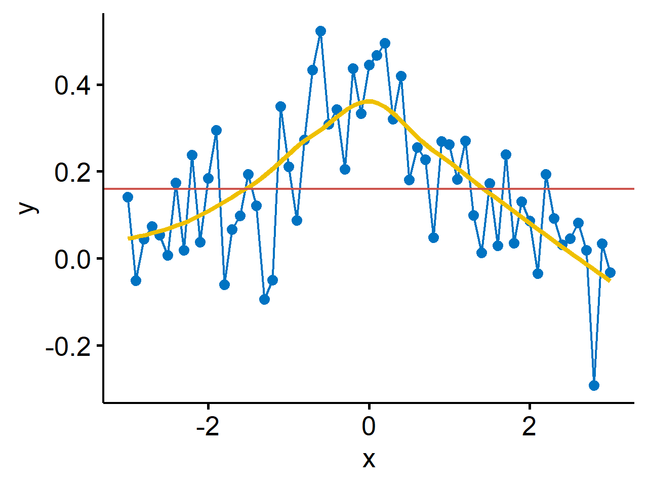 ↩︎1 2 3 4 5 6 7 8 9 10 11library(tidyverse) library(ggpubr) set.seed(42) df <- tibble( x = seq(-3, 3, by = 0.1), y = dnorm(x, 0, 1) + rnorm(length(x), 0, 0.1) ) ggline(df, x = "x", y = "y", color = "#0073C2", numeric.x.axis = T)+ geom_smooth(color = "#EFC000", method = "loess", se = F)+ geom_abline(slope = 0, intercept = mean(df$y), color = "#CD534C")Cleveland, William S. “Robust locally weighted regression and smoothing scatterplots.” Journal of the American statistical association 74.368 (1979): 829-836. ↩︎