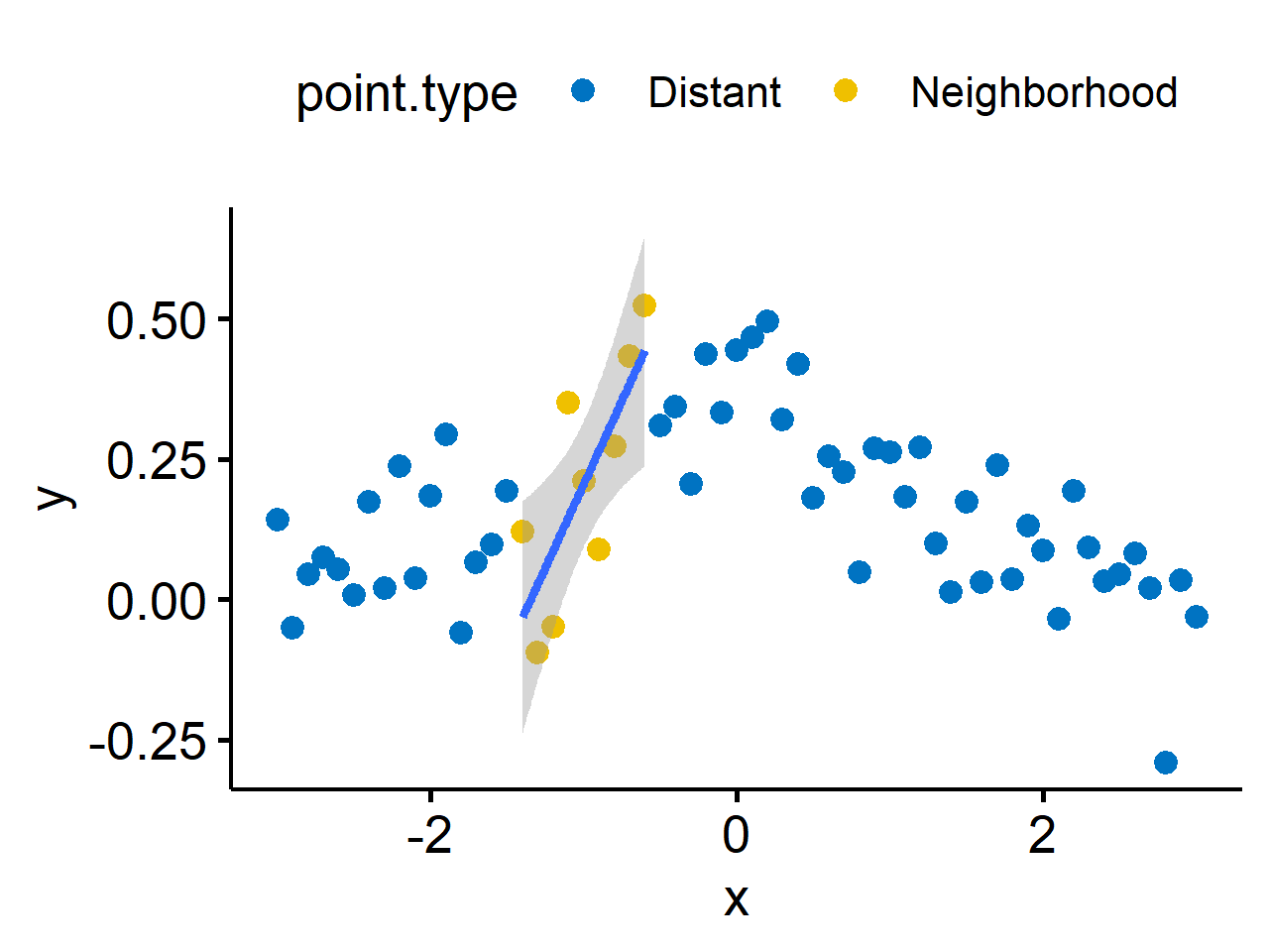 ↩︎1 2 3 4 5 6 7 8 9 10 11library(tidyverse) library(ggpubr) set.seed(42) df <- tibble( x = seq(-3, 3, by = 0.1), y = dnorm(x, 0, 1) + rnorm(length(x), 0, 0.1), point.type = ifelse(x > -1.5 & x < -0.5, "Neighborhood", "Distant") ) ggscatter(df, "x", "y", color = "point.type", palette = "jco") + geom_smooth(data = subset(df, x > -1.5 & x < -0.5), method = "lm")