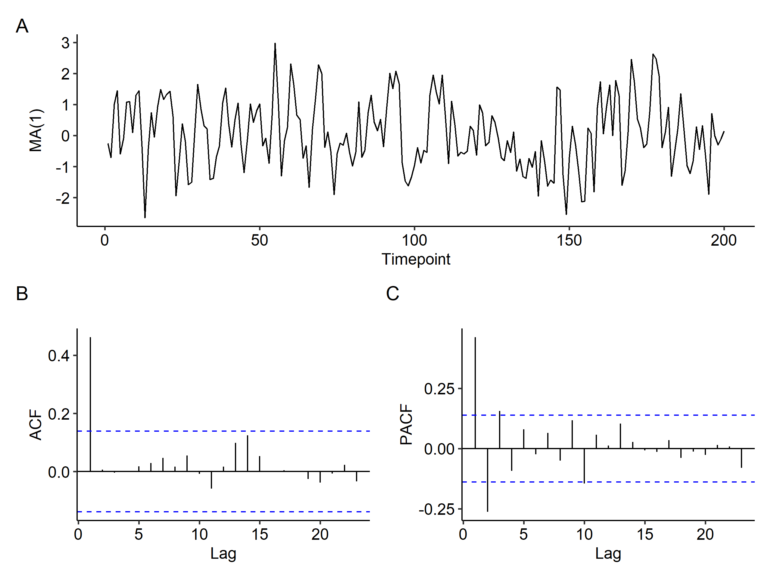 Here’s an example of a simulated MA(1) series with $n=200$ timepoints1. We can see the tail off pattern in the ACF and the cut off after lag 1 in the PACF.
