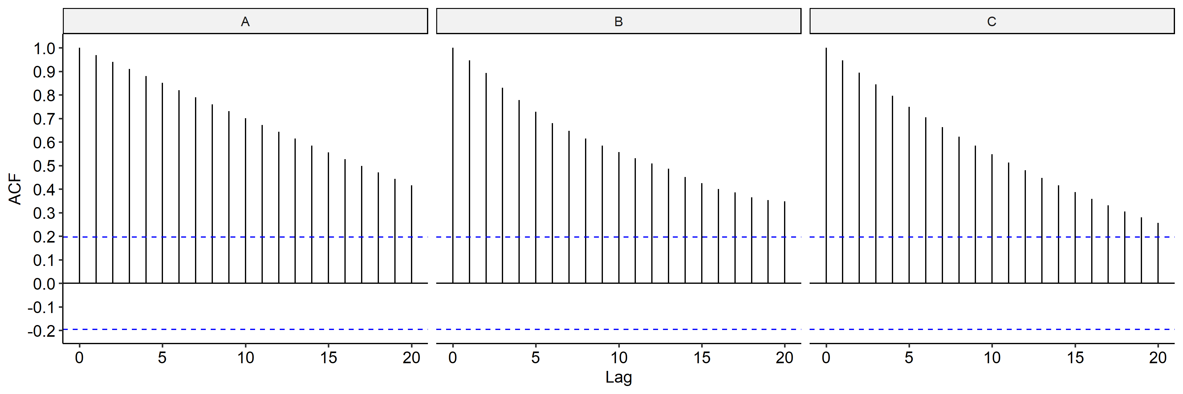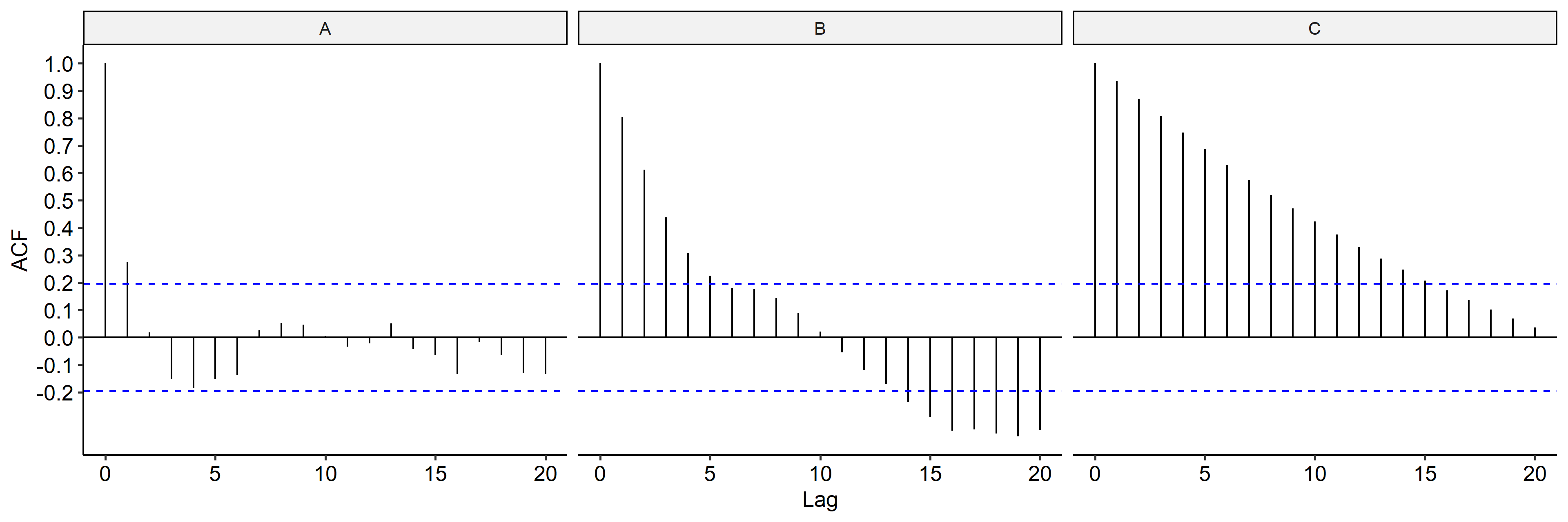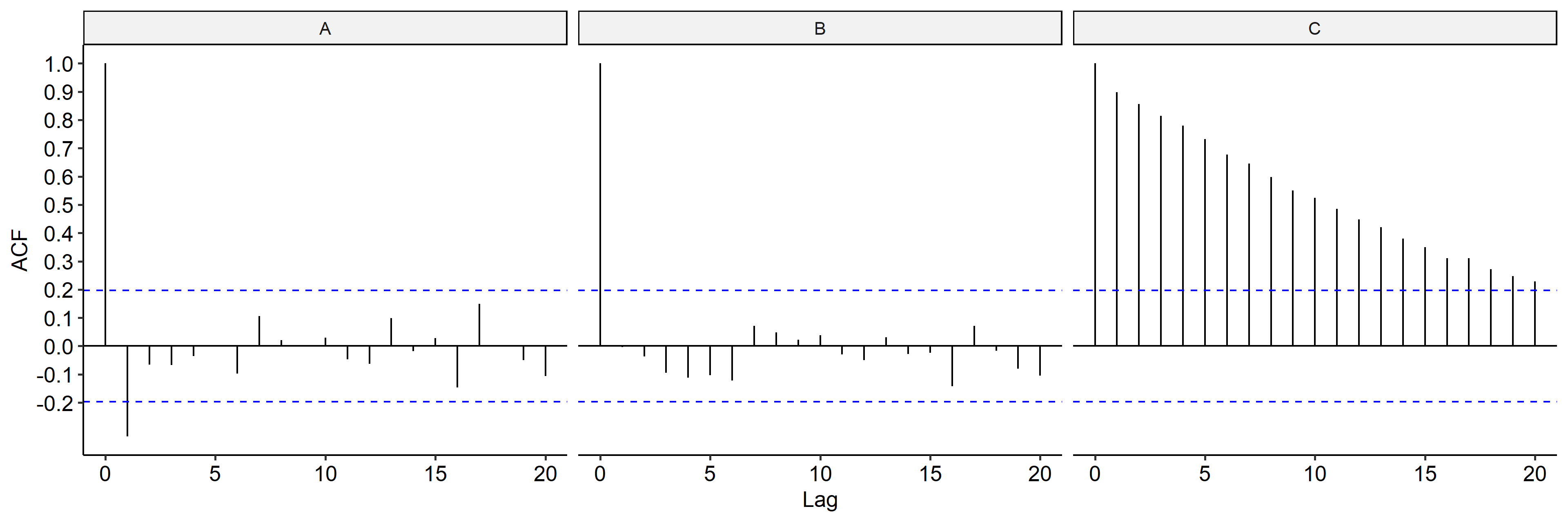↩︎1 2 3 4 5 6 7 8 9 10tibble( Timepoint = seq(n), A = x1, B = x2, C = x3 ) %>% pivot_longer(names_to = "Series", values_to = "Value", -Timepoint) %>% ggplot(aes(Timepoint, Value)) + geom_line() + facet_wrap(~ Series, nrow = 1, scales = "free_y") + labs(x = "Time", y = expression(X[t])) + ggpubr::theme_pubr()R code for calculating the ACF. The dashed blue lines represent an approximate 95% confidence interval for a white noise. ACF falling within the lines indicate no serual correlation.