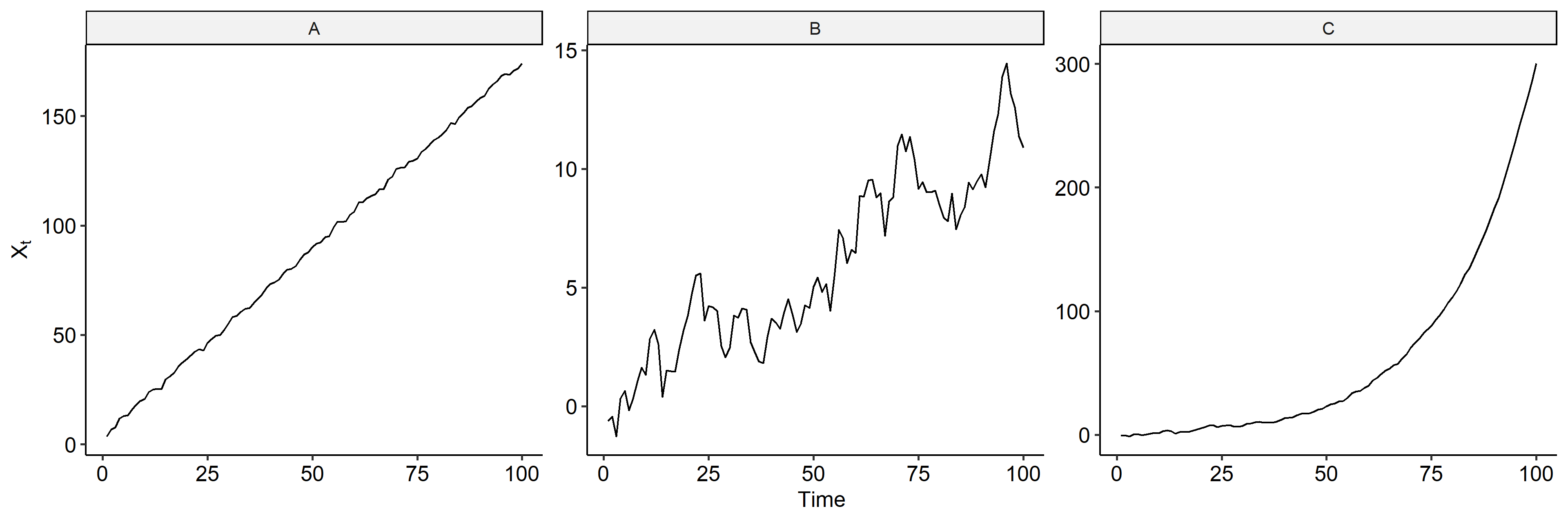 We can plot the series to see how they change over time3. There’s a clear linear trend in model A. Model B looks like it’s increasing but that’s just the characteristics of a random walk. Model C is exponentially increasing. Note the scales on the y-axis are different.