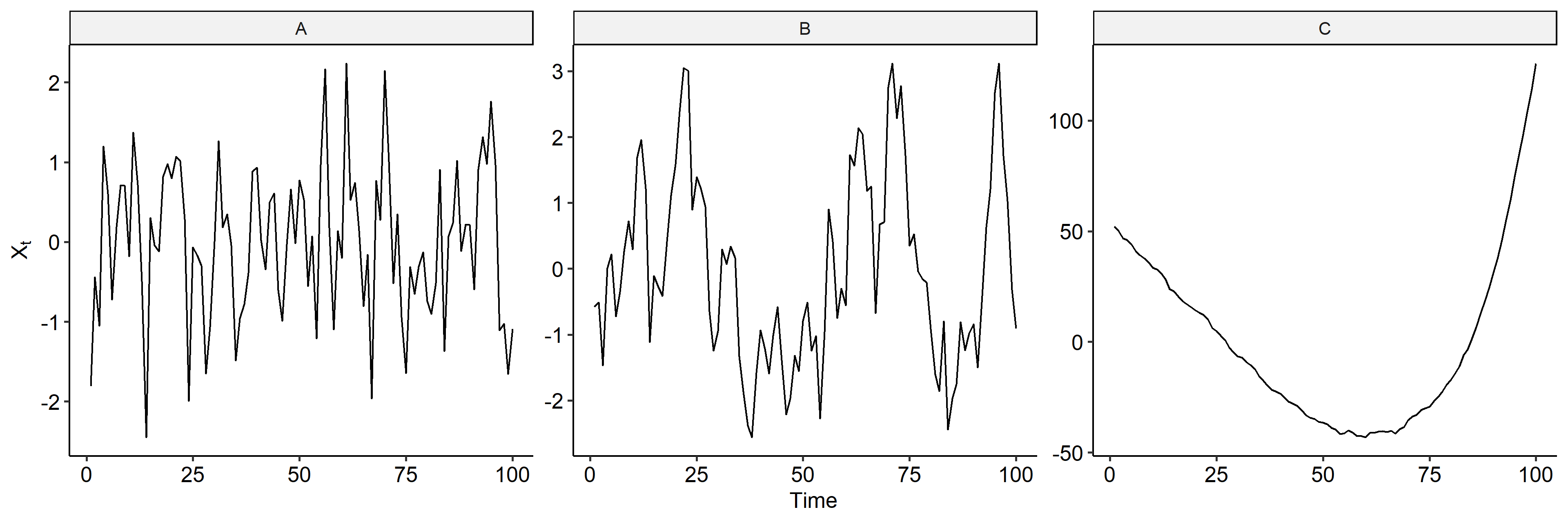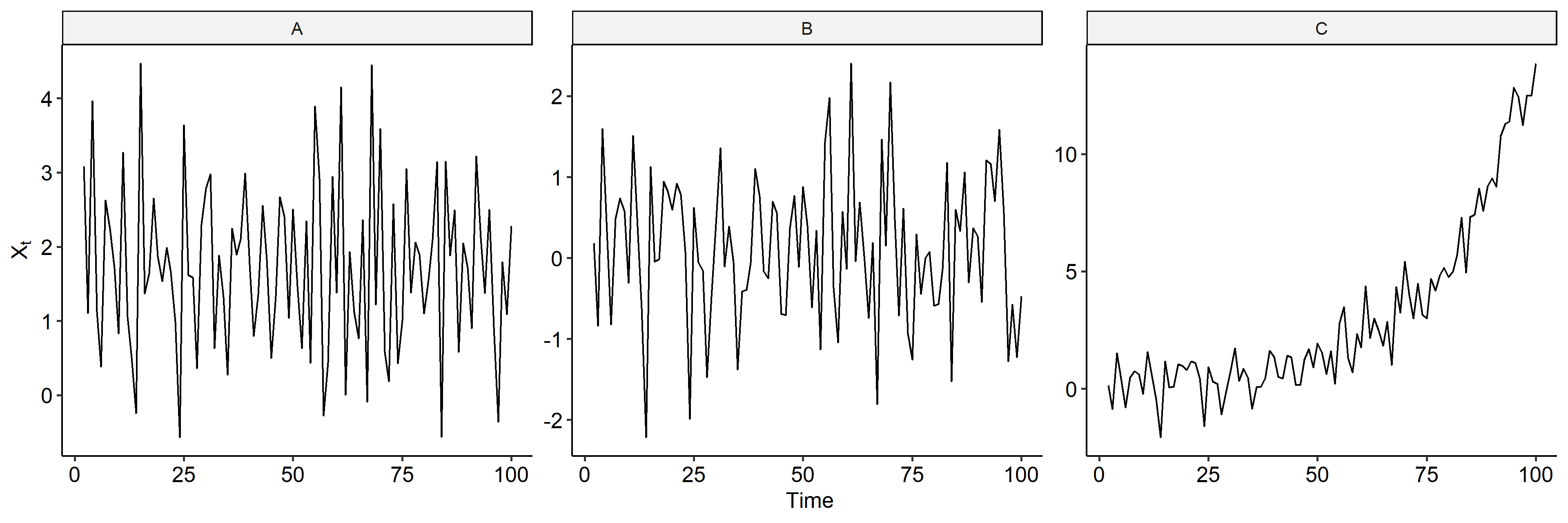 dplyr::lag().↩︎1 2 3 4 5 6 7 8 9 10 11 12 13 14tibble( Timepoint = seq(n), A = x1, B = x2, C = x3 ) %>% mutate(A = A - lag(A), B = B - lag(B), C = C - lag(C)) %>% drop_na() %>% pivot_longer(names_to = "Series", values_to = "Value", -Timepoint) %>% ggplot(aes(Timepoint, Value)) + geom_line() + facet_wrap(~ Series, nrow = 1, scales = "free_y") + labs(x = "Time", y = expression(X[t])) + ggpubr::theme_pubr()R code for preparing the data frame for plotting.