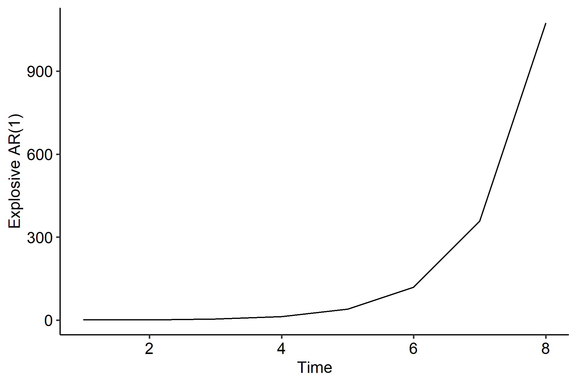 Another example is the explosive AR(1). Previously we showed that the stationary condition for an AR(1) model is $|\phi| < 1$. But when $|\phi| > 1$, for example