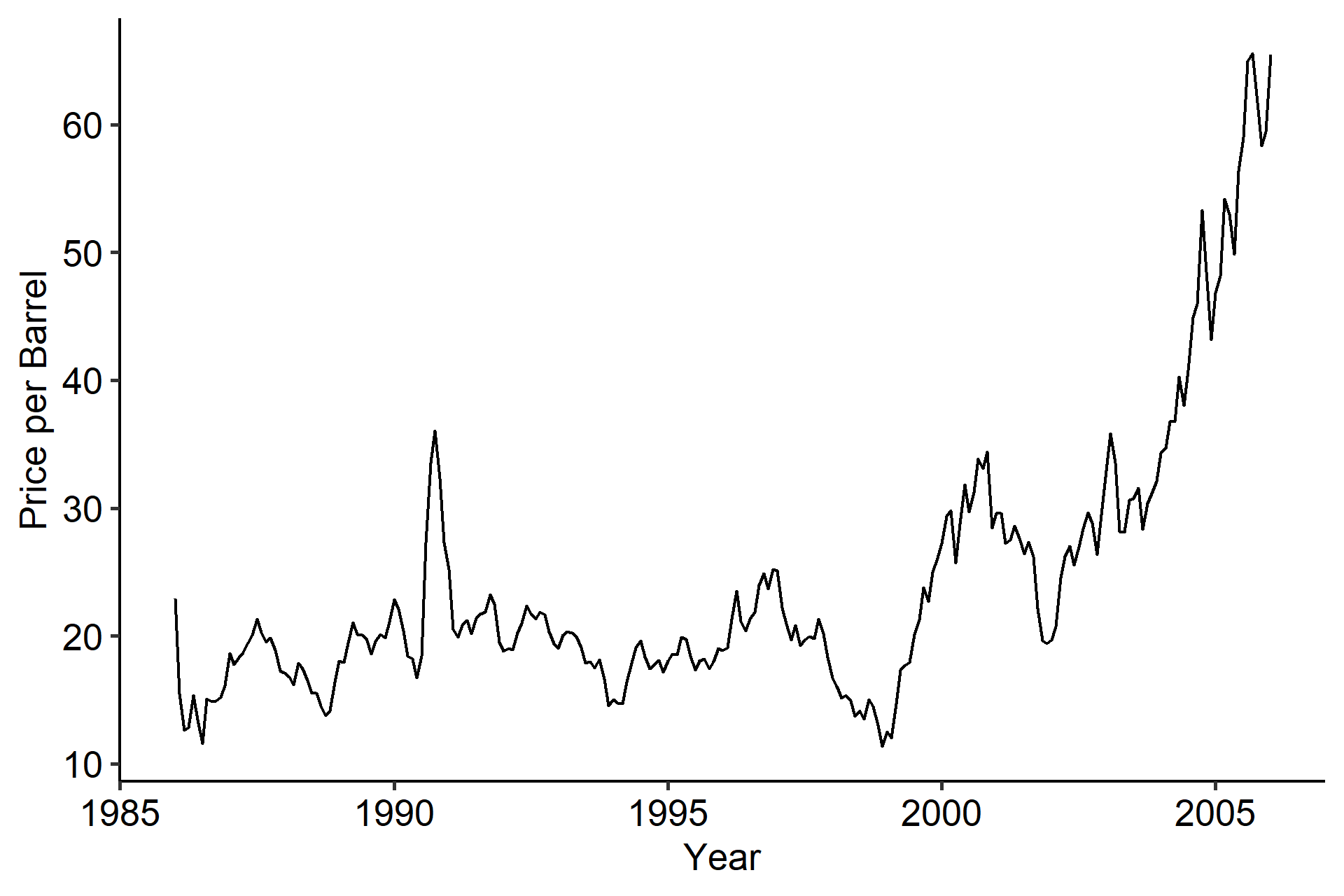 TSApackage to get the dataset.↩︎1 2 3 4 5 6 7 8 9 10 11 12 13library(tidyverse) library(TSA) data("oil.price") tibble( Timepoint = time(oil.price), x = oil.price ) %>% ggplot(aes(Timepoint, x)) + geom_line() + labs(x = "Year", y = "Price per Barrel") + ggpubr::theme_pubr()When $|\phi| = 1$, we have a random walk. ↩︎