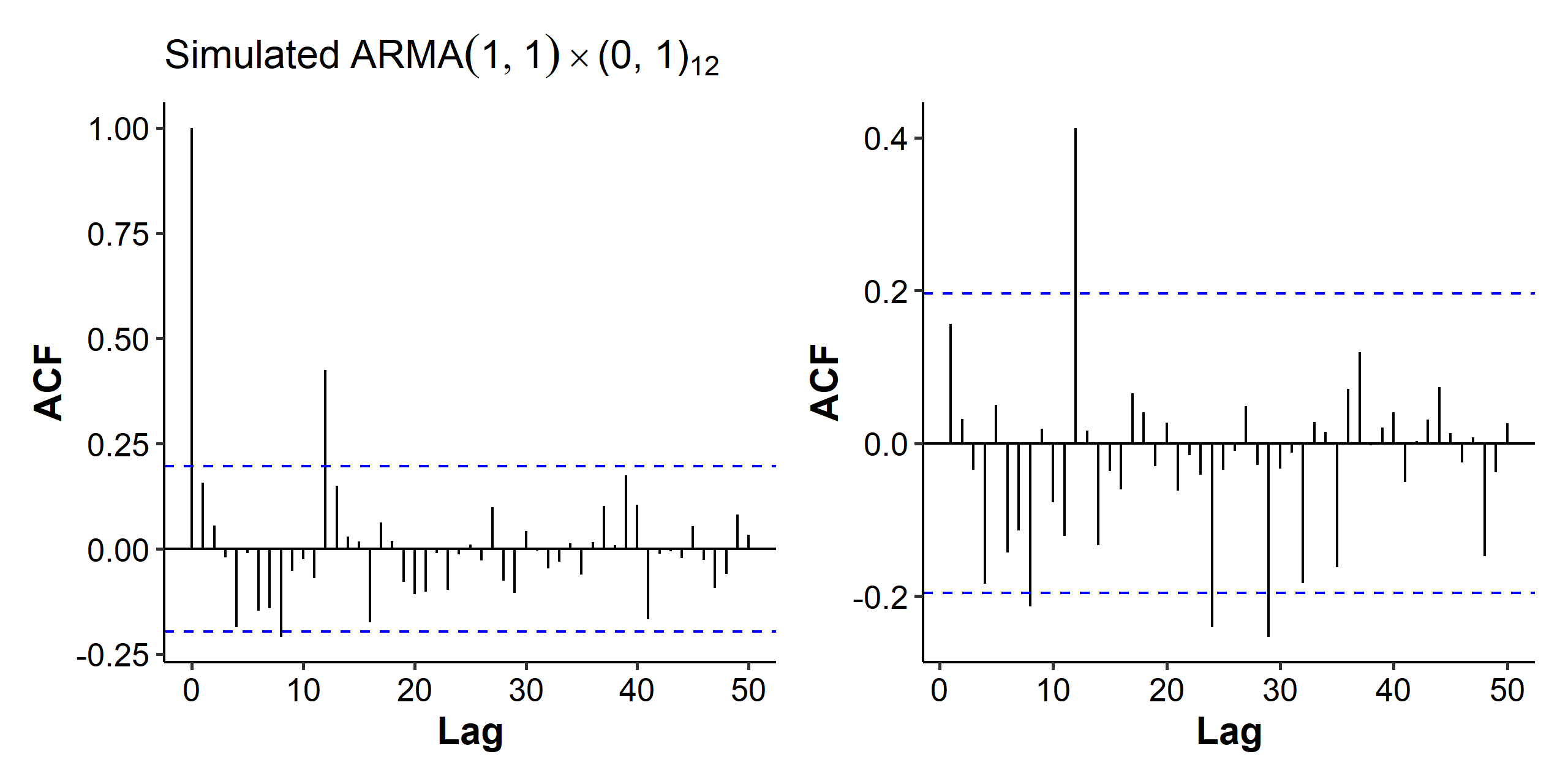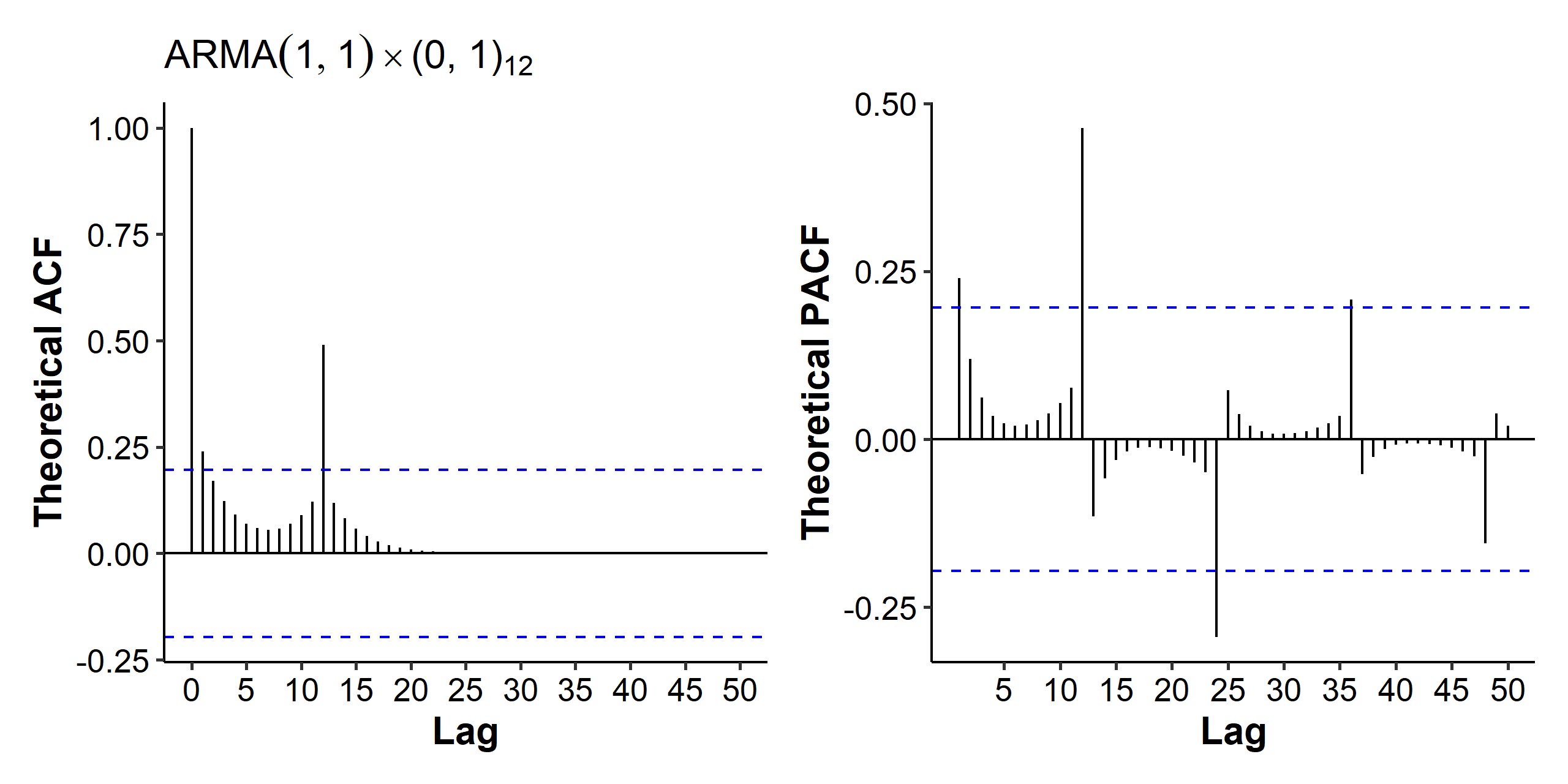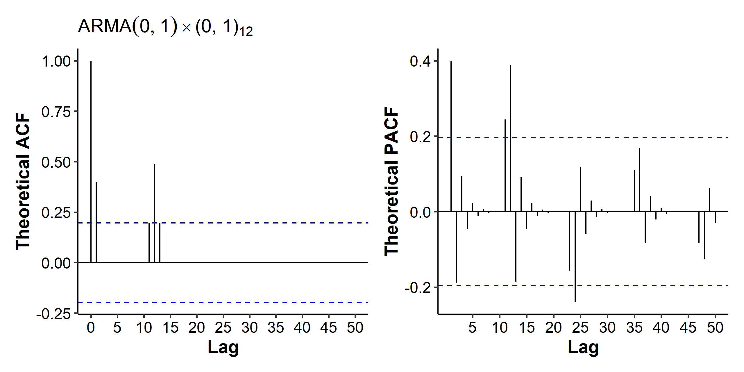 Now we are going to combine the regular ARMA and seasonal ARMA models. This is done by multiplying the AR/MA polynomials. For example, the multiplicative combination of $MA(1)$ and $MA(1)_{12}$ is denoted $ARMA(0, 1) \times (0, 1)_{s=12}$, and can be expressed as