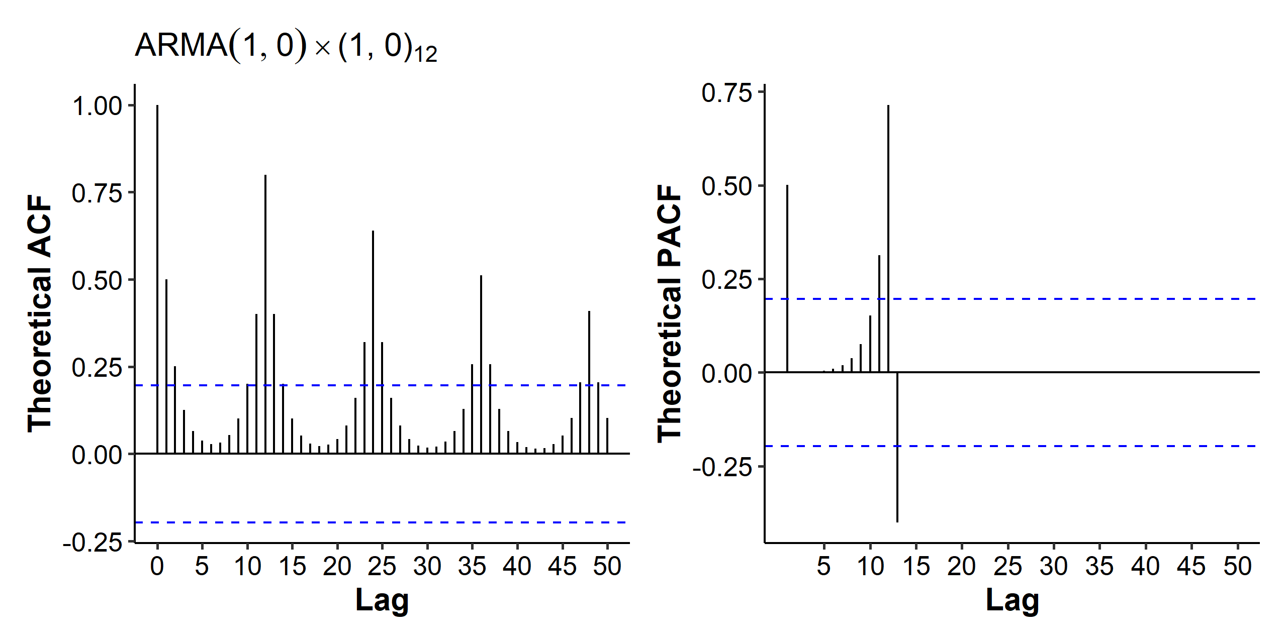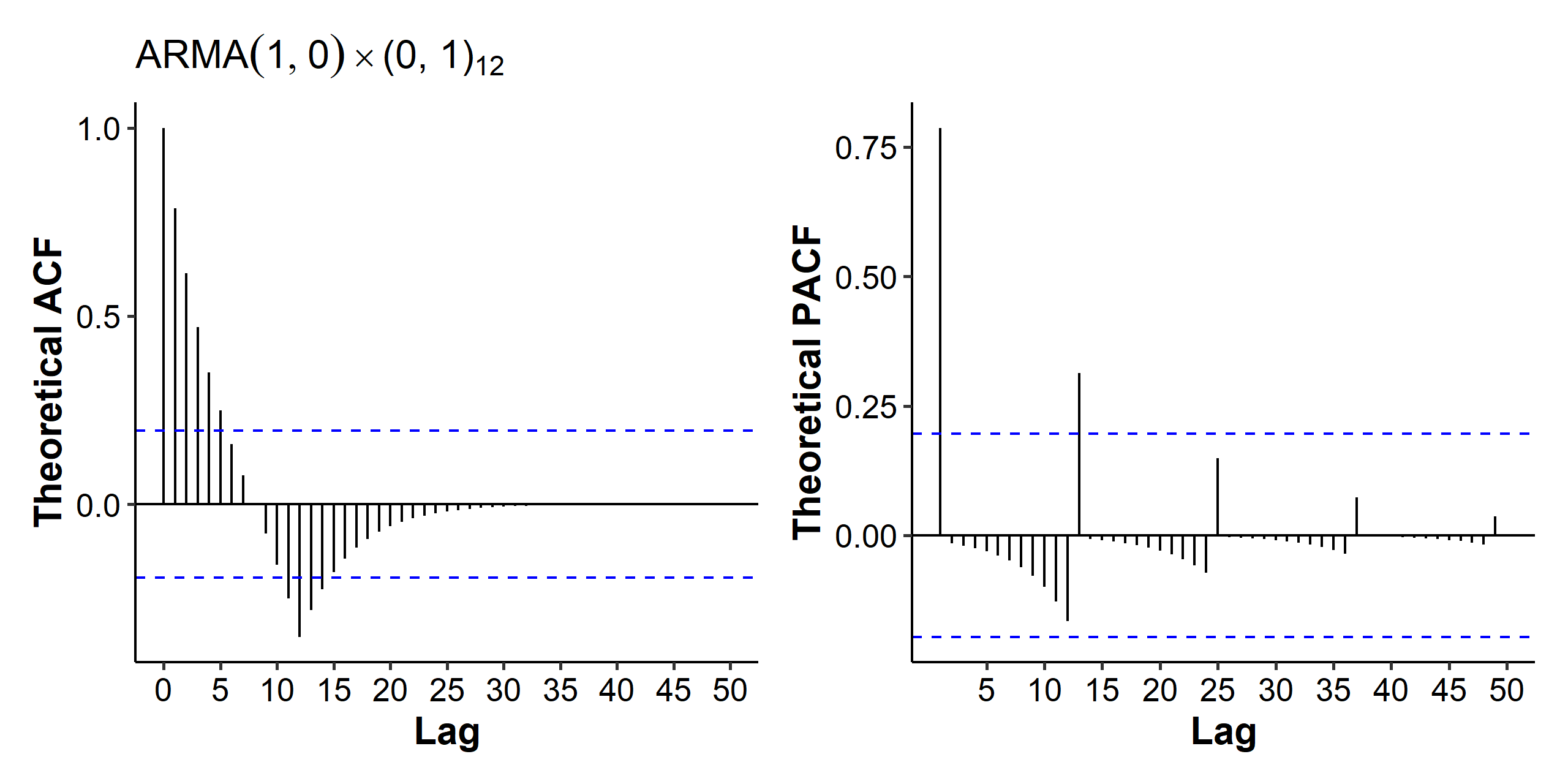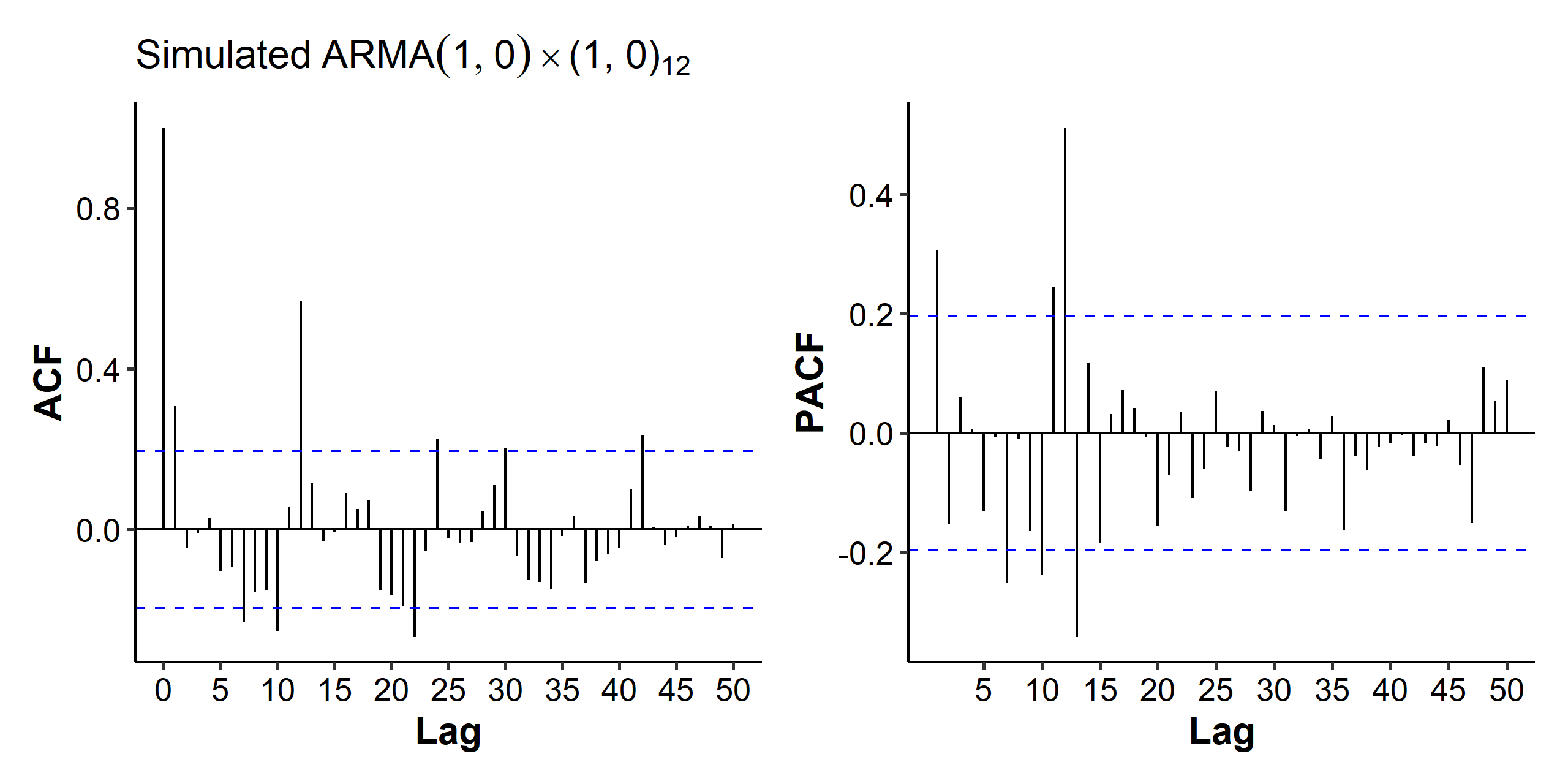 In this section we’re going to explore the theoretical ACF and PACF of multiplicative seasonal ARMA models of different orders2. Just like how the (P)ACF of ARMA models were combinations of the (P)ACF of AR and MA models, we can think of multiplicative seasonal ARMA models as overlaying another seasonal component on the (P)ACF.