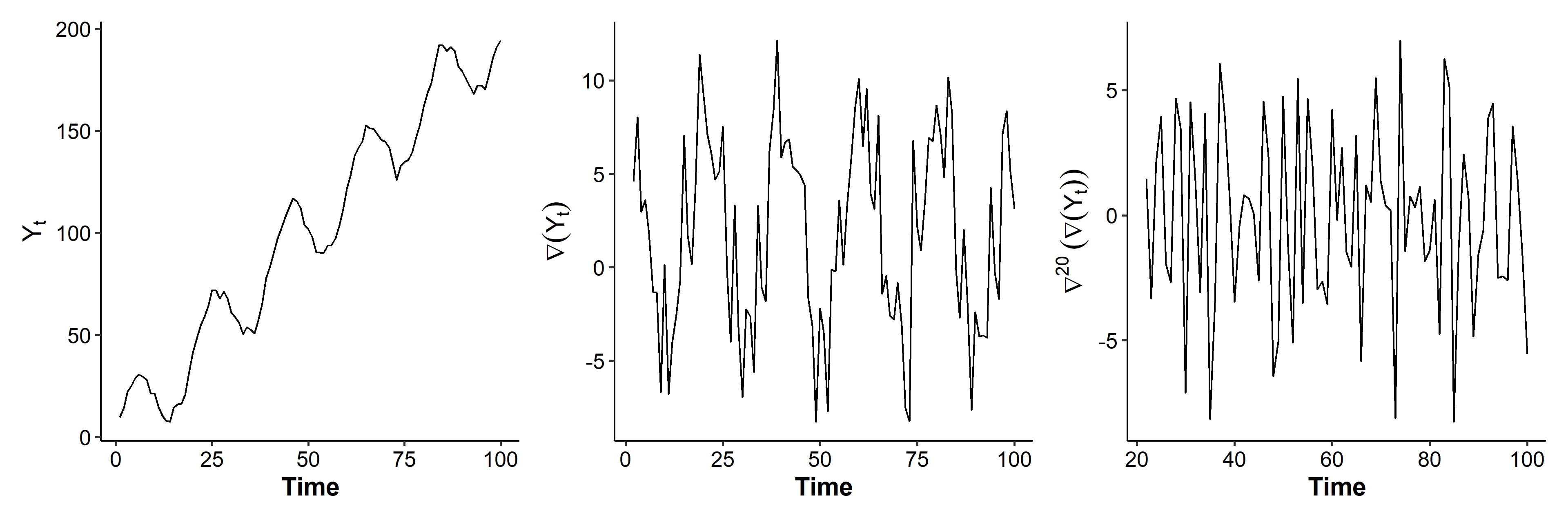 where $E(Z_t) = 0$, $S_{t+d} = S_t$, and $\sum_{j=1}^d S_j = 0$. Here $d$ is the period, so we’re assuming the seasonal effect in say May this year is the same as the effect in May of last year. Then, to eliminate the seasonal component by differencing, we may use the lag-$d$ differencing operator: