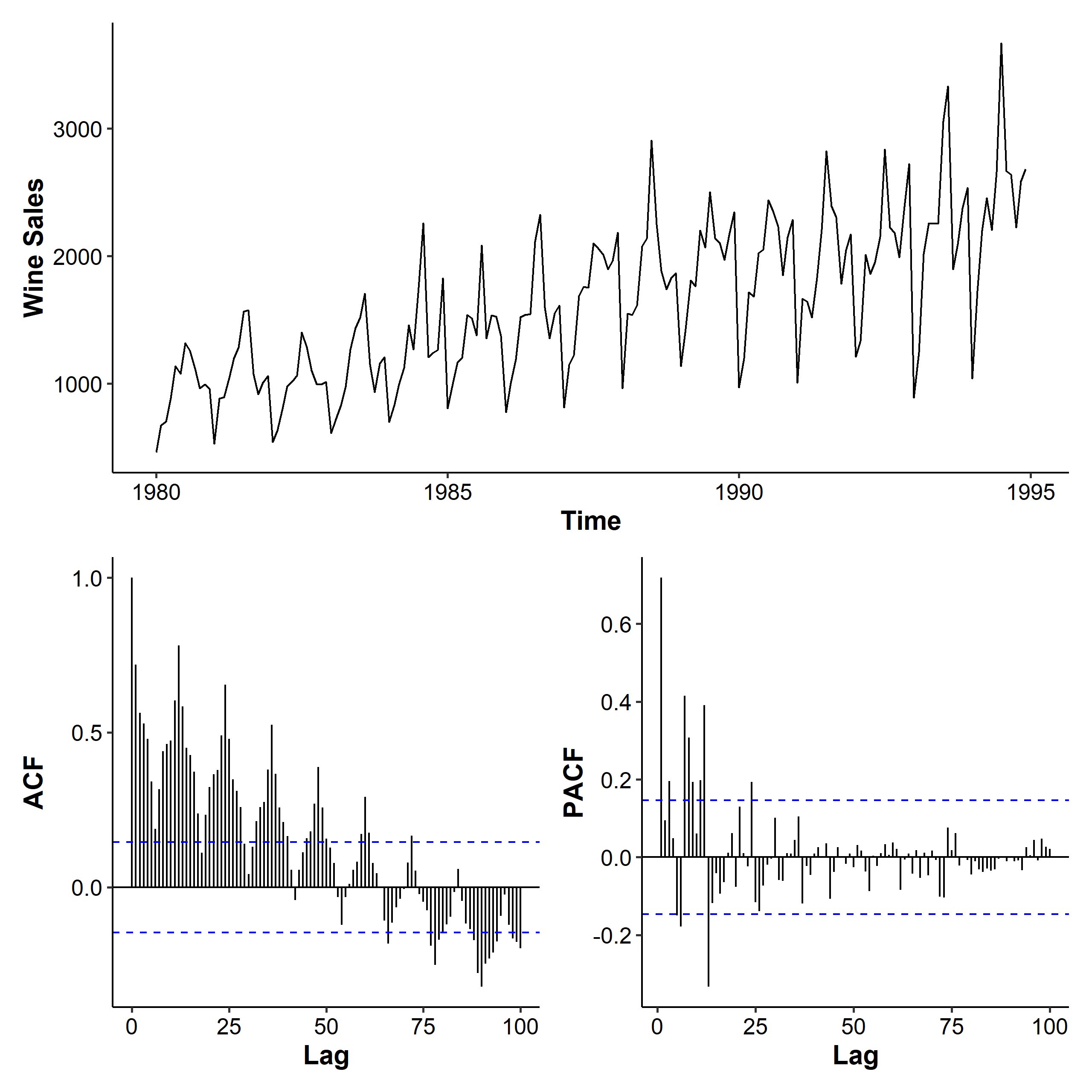 As always, we first plot the series and its ACF and PACF. On top of the mean and variance increases over time, we also observe a periodical pattern that repeats every year. This means we might be able to use the sales in June 1985 to predict the sales in June 1986. In seasonal AR(1) (MA(1)), $X_{t-12}$ ($Z_{t-12}$) can be used to predict $X_t$; in seasonal AR(2), $X_{t-12}$ and $X_{t-24}$ can be used to predict $X_t$, etc.