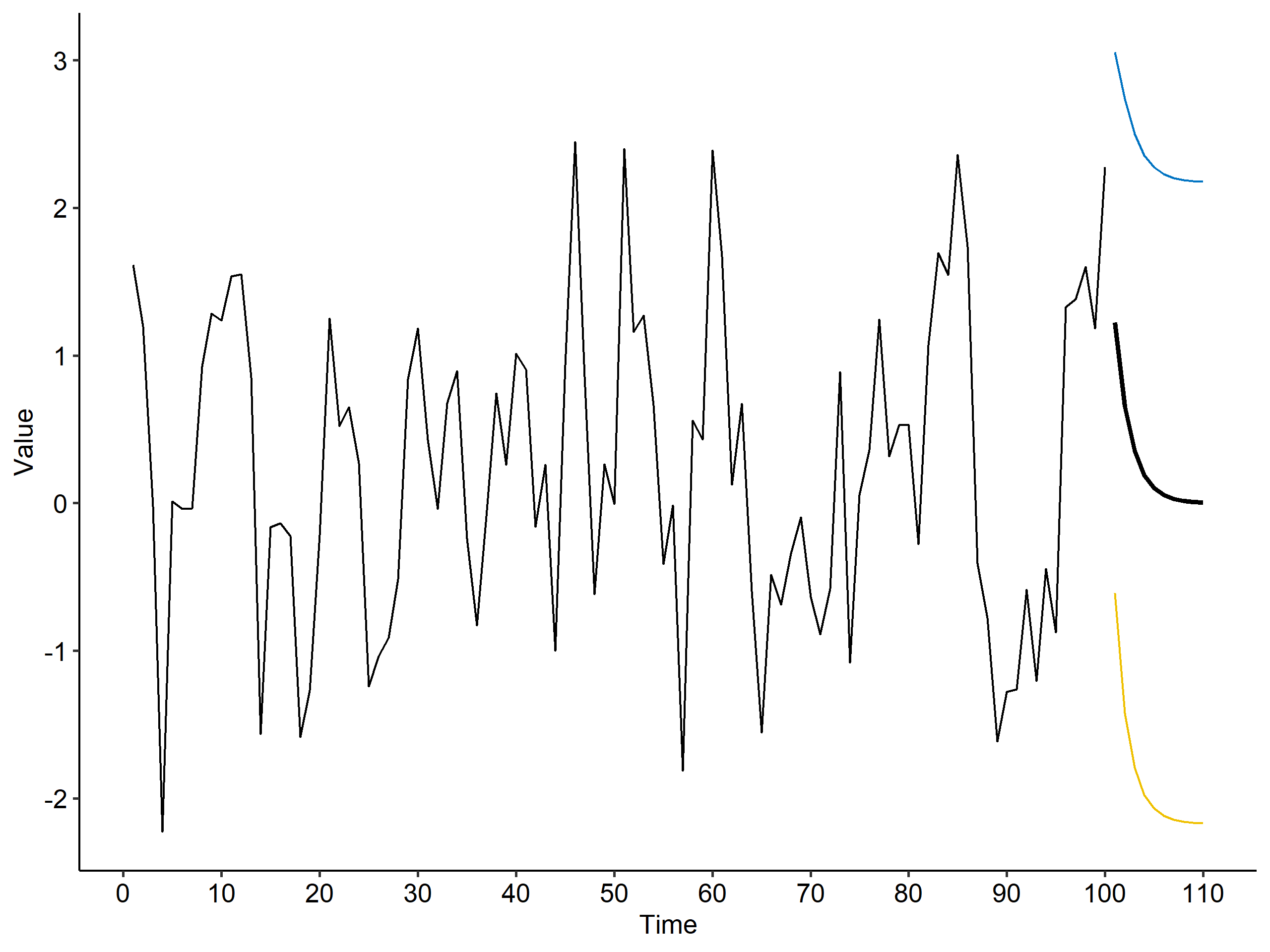 ↩︎1 2 3 4 5 6 7 8 9 10 11 12 13 14 15 16 17dat.x <- enframe(x) %>% select(Time = name, Value = value) dat.x.fore <- enframe(x.fore$pred) %>% select(Time = name, Value = value) %>% mutate(Time = Time + 100, Upper = U, Lower = L) ggplot(dat.x, aes(x = Time, y = Value)) + geom_line() + geom_line(data = dat.x.fore, size = 1) + geom_line(data = dat.x.fore, aes(y = Upper), color = "#0073C2") + geom_line(data = dat.x.fore, aes(y = Lower), color = "#EFC000") + ggpubr::theme_pubr() + scale_x_continuous(breaks=seq(0, 110, 10)) + theme(legend.position = "none")