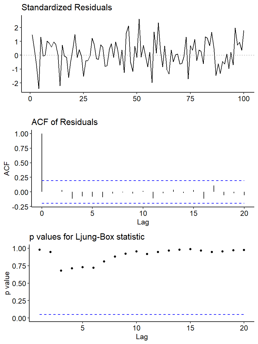 Next we check the assumptions of the fitted model. The tsdiag() function generates three diagnosis plots: the standardized residuals plot, the ACF of the residuals, and the p-values for the Ljung-Box statistic. The gof.lag parameter gives the maximum number of lags for the test.